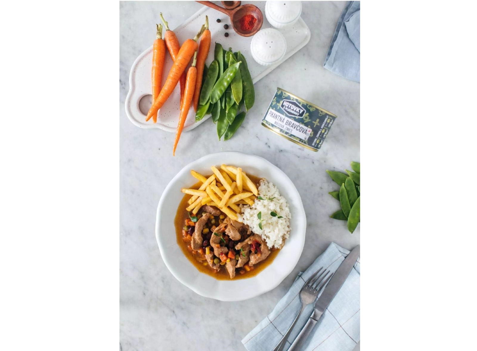 Základom jedla je bravčové mäso zo stehna (31,5 %) zo slovenského chovu, ktoré je známe svojou jemnosťou a šťavnatosťou. V kombinácii so zeleninovou zmesou a koreninami vzniká vyvážené sterilizované hotové jedlo, ktoré chutí ako domáca kuchyňa. Táto konzerva hotového jedla je navrhnutá pre maximálnu praktickosť. Nepotrebuje chladenie, má dlhú trvanlivosť a je pripravená na okamžitú konzumáciu.